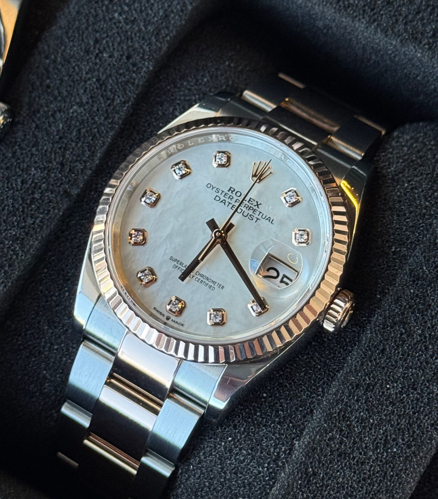Rolex Datejust two tone oro rosa, dial madre perla con diamantes.